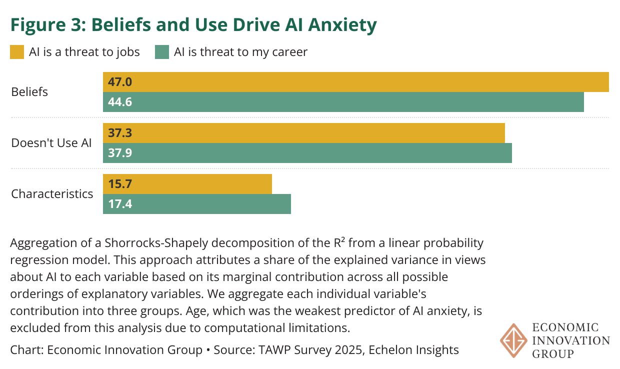 Even though AI use is the single strongest predictor of AI anxiety, this bundle of pessimistic beliefs together helps explain more of the variation in AI anxiety, each soaking up about 12 percent of the variation on average.