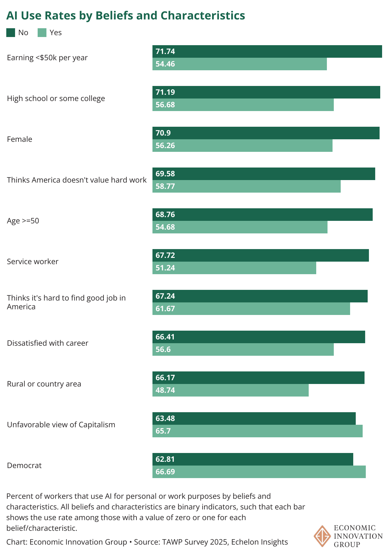 The chart below describes how the use of AI (for work or personal tasks) varies by individual beliefs and characteristics. The highest AI use rate is among those earning more than $50 thousand per year (72%) followed by those with a college education (71%) and males (71%). The lowest use rates are found among workers in rural communities (49%).