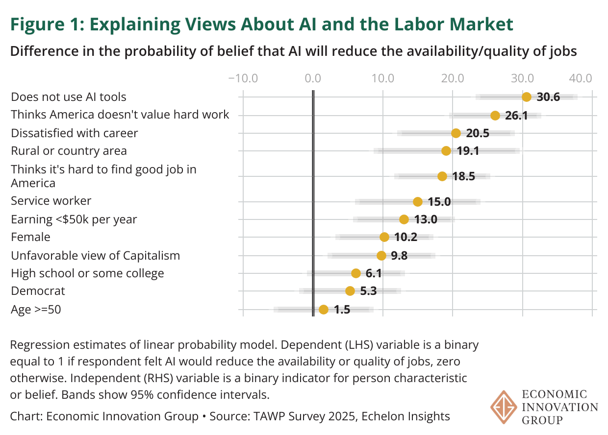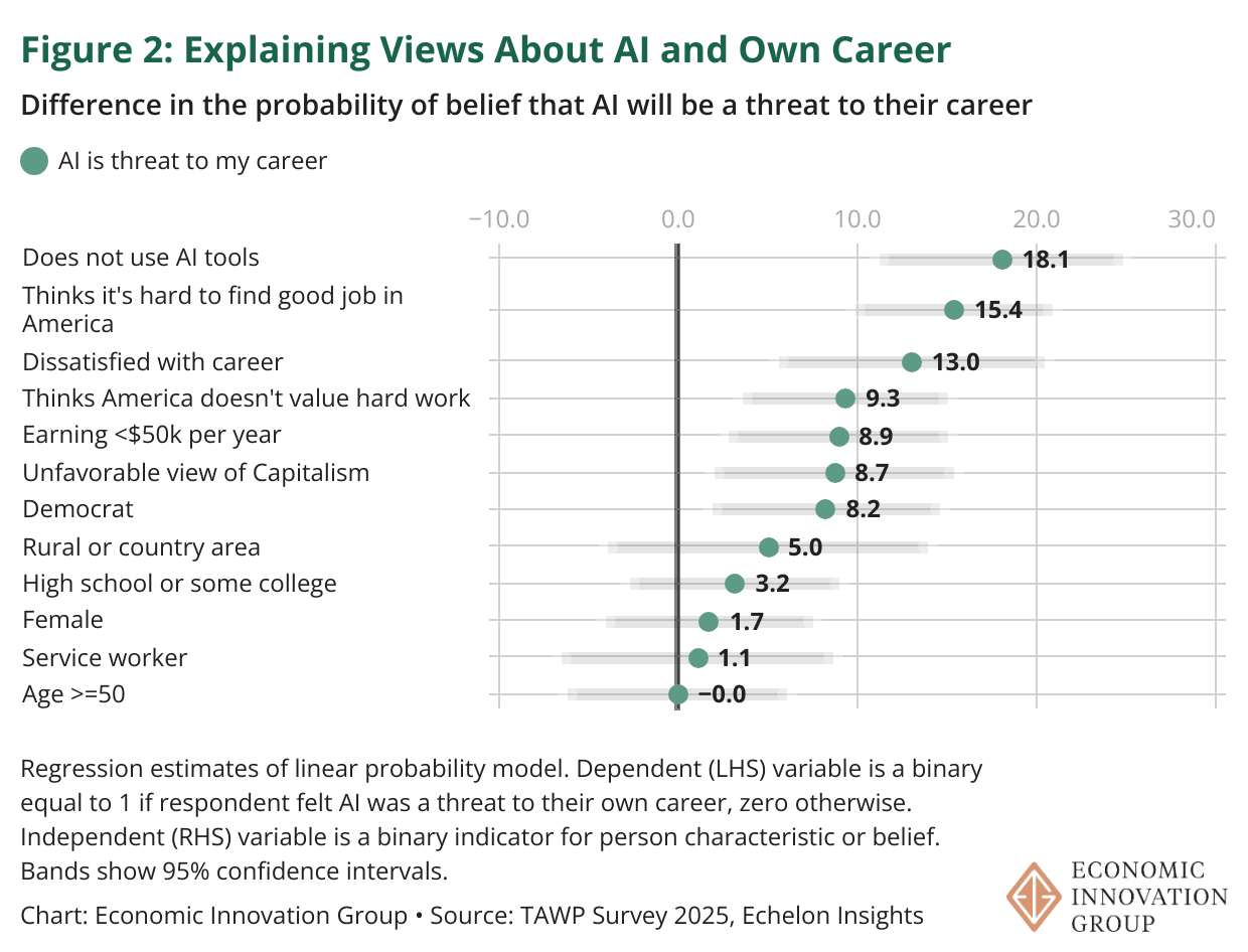 Three of the five largest differences center around beliefs. Workers who express pessimism about societal appreciation of hard work, the availability of good jobs in the economy, and those dissatisfied with their career are 18 to 26 percentage points more likely to see AI as a threat to jobs.