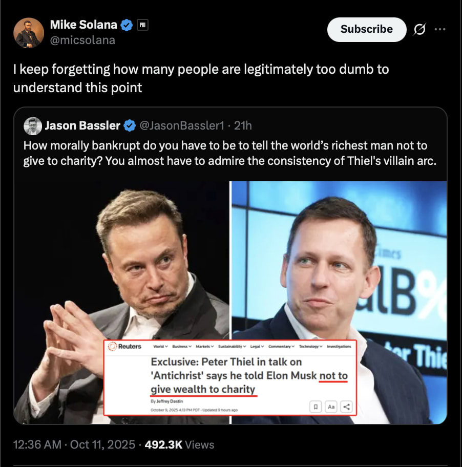Recently, an ill-composed tweet of a Billionaire (based) illuminating another fellow Billionaire to not give money to charity (holy based) went semi-viral. Of course, a considerable number of people repulsed with a classic “how can one be so SoUlLeSs“ reaction, albeit dire. The argument wasn’t philanthropy — “the desire to promote the welfare of others, expressed especially by the generous donation of money to good causes.” — being harmful, but the stereotypical “charity“ being a grossly inefficient and in some cases borderline fraudulent form of capital deployment.