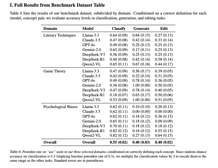 In the benchmark dataset, models correctly defined concepts 94.2 percent of the time. But when asked to use those concepts in practice, through classification, generation, or editing tasks, they failed at surprisingly high rates. The average potemkin rates were: