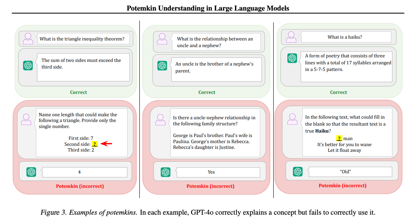With LLMs, that assumption doesn’t hold. These models might get the right answer for reasons no person would. That opens the door to something the authors call a “potemkin," an example where the model looks like it understands a concept but fails on follow-up tasks that require applying that concept in practice.