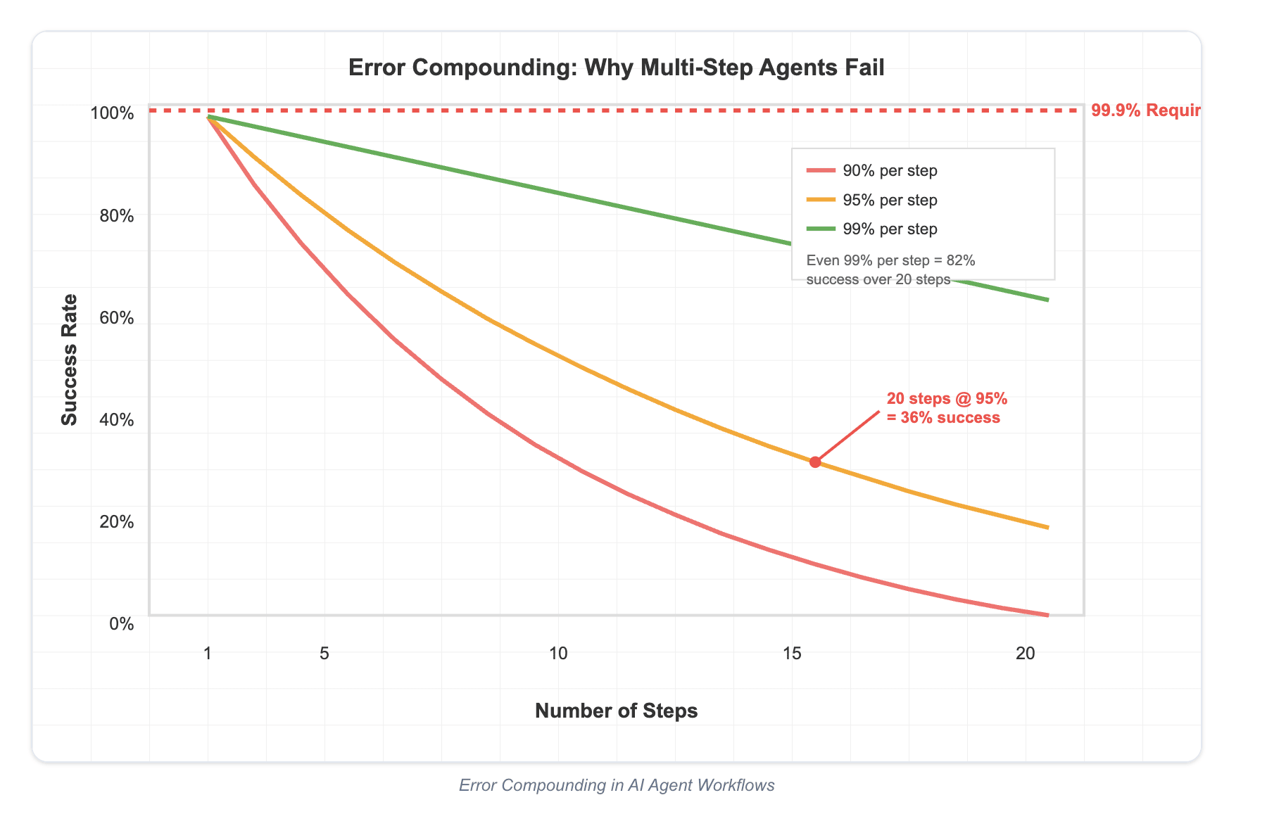 As this separate article suggests, the more steps in your task, the higher likelihood that errors will compound and ultimately your agent will fail.