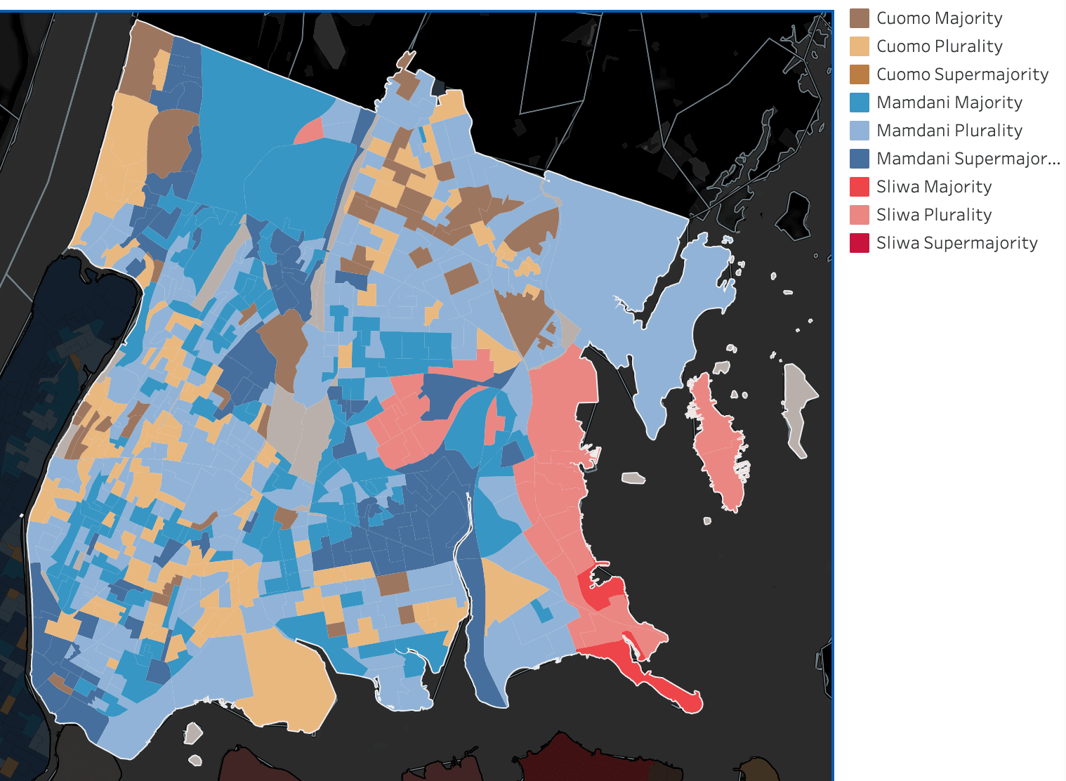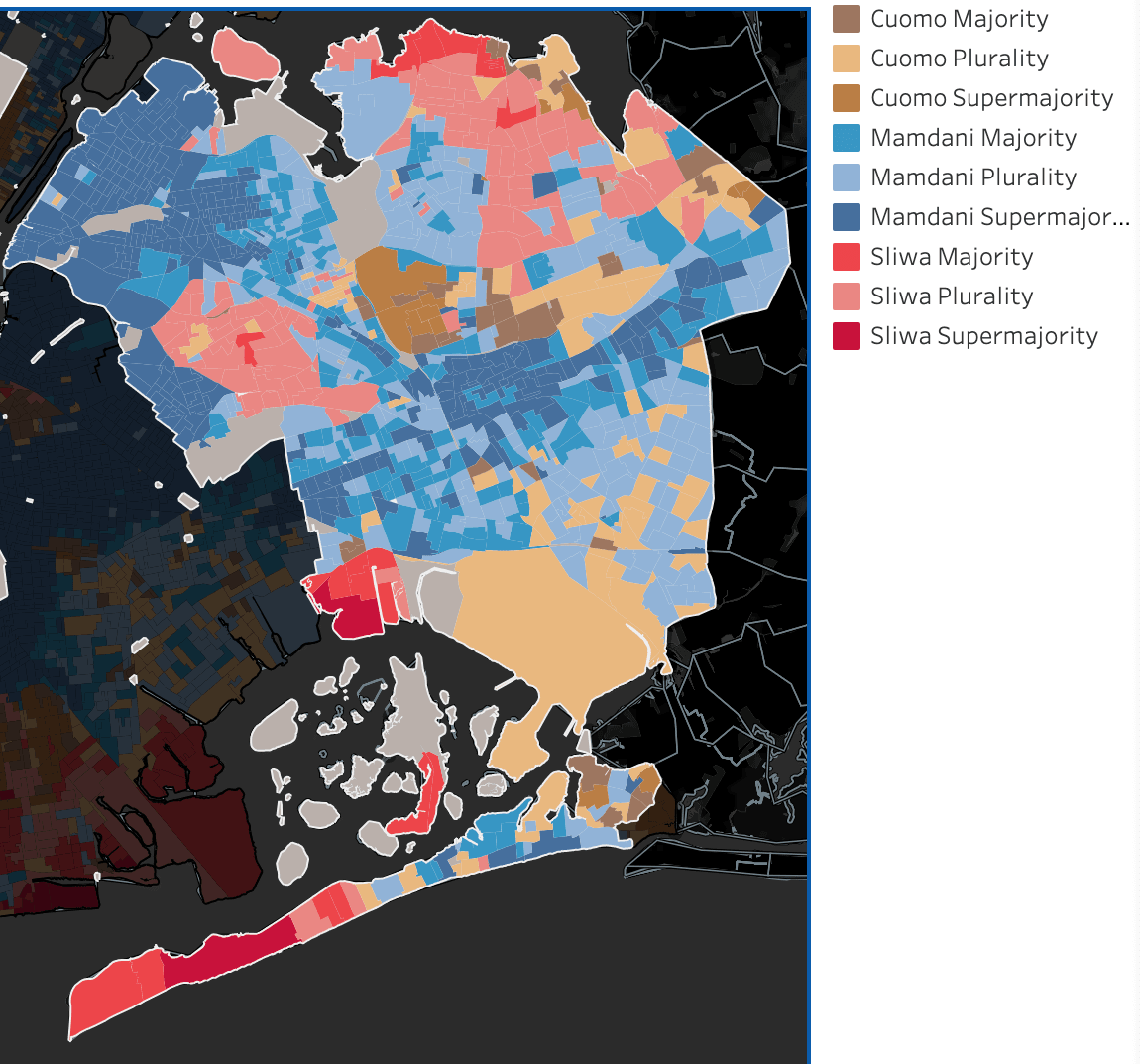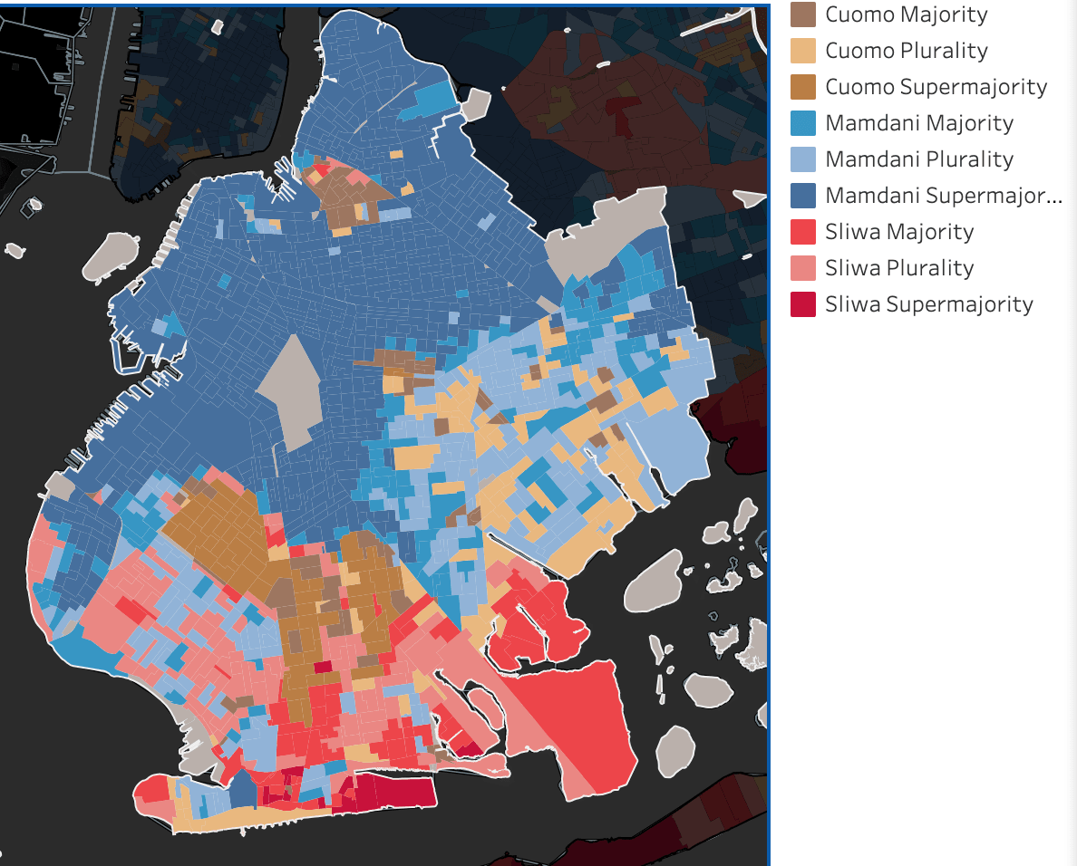 Both Chinatowns in Queens, Elmhurst and Flushing, are enclaves where Mamdani will expand his head-to-head lead versus Cuomo. Flushing, in particular, should be a fascinating battleground between Mamdani and Sliwa, whereas Cuomo will almost assuredly finish a distant third. College Point, a nearby peninsula of working-and-middle-class Chinese and Hispanic immigrants, won decisively by Donald Trump last November, has a strong chance of being retaken by Mamdani. The incredible influence of South Asian voters, activated like never before through Mamdani’s campaign, can be seen along the dark blue of Hillside Avenue, which stretches from South Richmond Hill to Glen Oaks. One year ago, this corridor experienced one of the most pronounced rightward shifts in the nation. In the wake of Trump’s victory, Mamdani’s breakout moment as a little known candidate for mayor came from talking to voters here, listening to their concerns. Since then, the democratic socialist has worked tirelessly to bring those communities back into the Democratic Party tent with an affirmative, costs-of-living focused agenda. Tomorrow night, at the epicenter of the World’s Borough, Mamdani is poised to do just that.