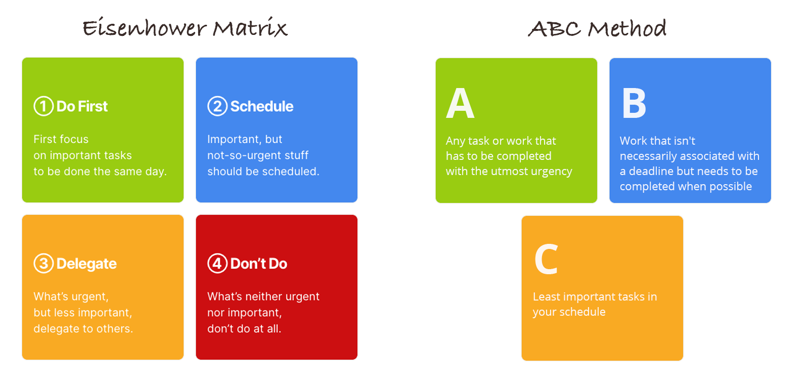 Use the Eisenhower Matrix (urgent vs. important) or the ABC method to sort tasks.