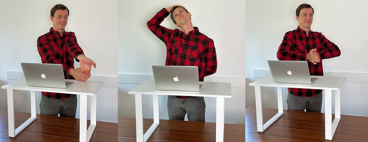 Active Break: Do 5–10 minutes of stretching near your desk or take a quick bike ride to grab a coffee, especially helpful after intense sitting or screen time. Here’s an example of some simple stretching exercises: