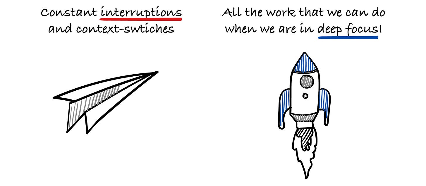 The most amount of work we do is when we are in deep focus for a longer amount of time. But constant interruptions, shifting priorities or changing directions negatively impact it.