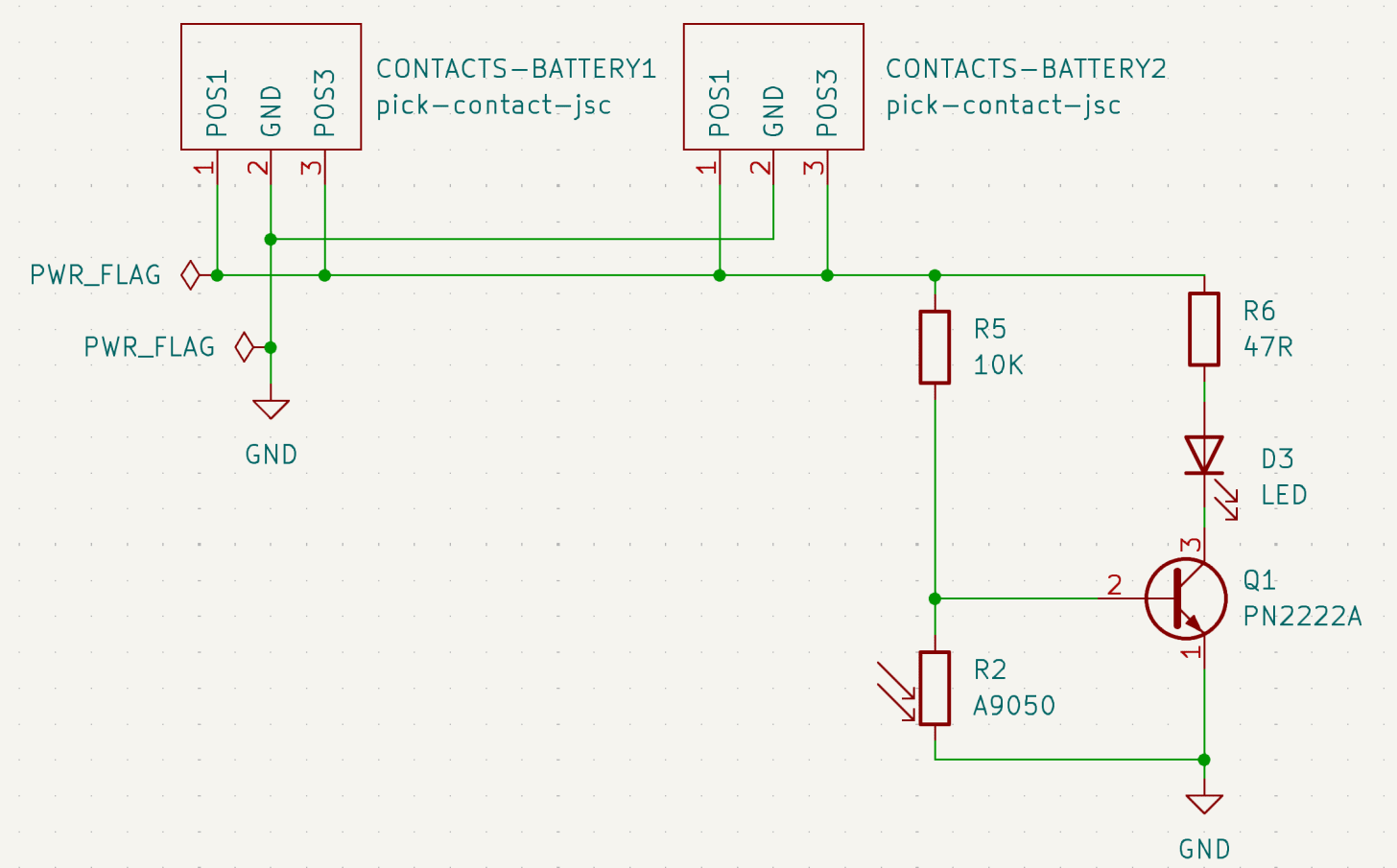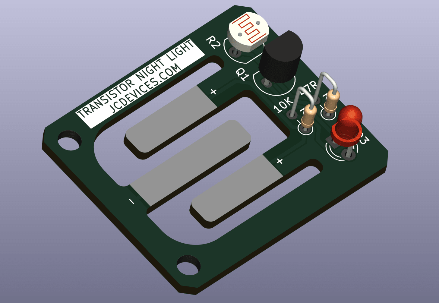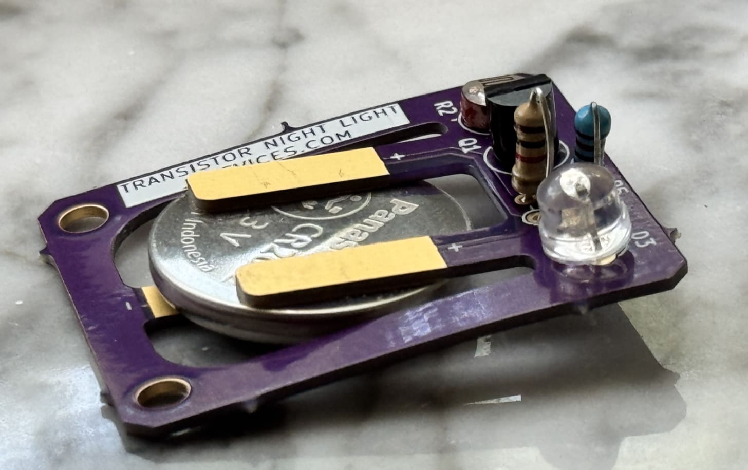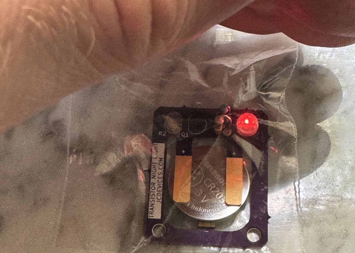Long story short, when it gets dark enough, the transistor (Q1) allows current to flow through the light-emitting diode (LED) to emit light. Resistor R6 limits the current flow to the LED, which was increased significantly (~1000Ω) to stretch out battery life. Maybe I could make it even higher.
