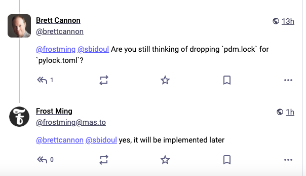 Even more notably, PDM maintainer Frost Ming confirmed that the project plans to fully migrate to pylock.toml in the future, eventually replacing its own pdm.lock format altogether.