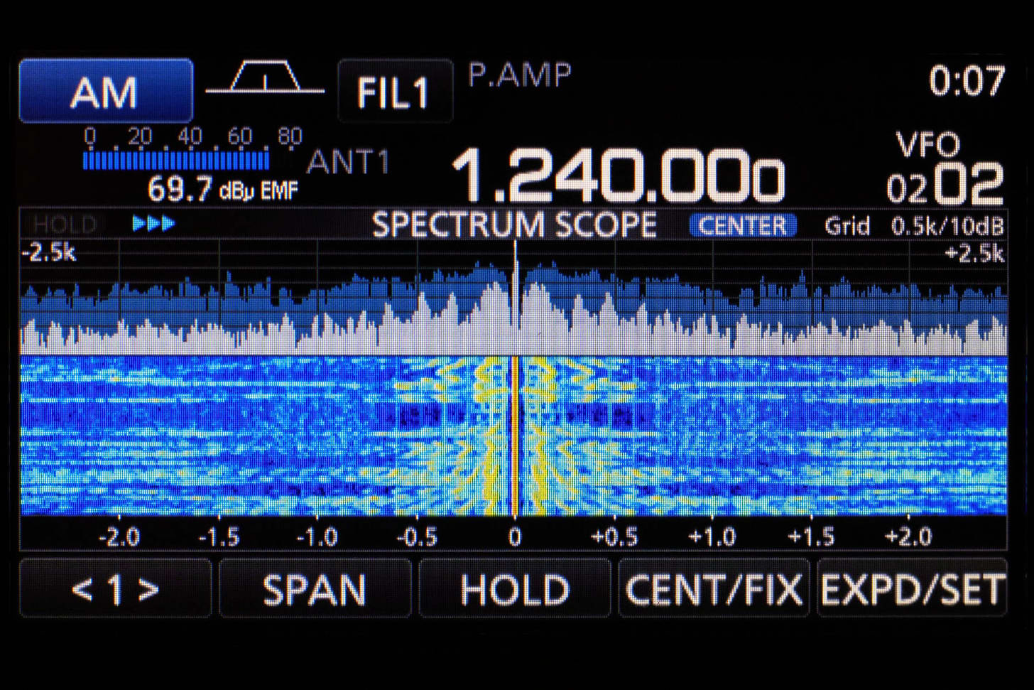 Well, no dice: recall from the discussion of the Fourier transform that any deviation from a steady sine introduces momentary artifacts in the frequency domain. The scale of the artifacts is proportional to the rate of change; AM is not special and takes up frequency bandwidth too. To illustrate, here’s a capture of a local AM station; we see audio modulation artifacts spanning multiple kHz on both sides of the carrier frequency: