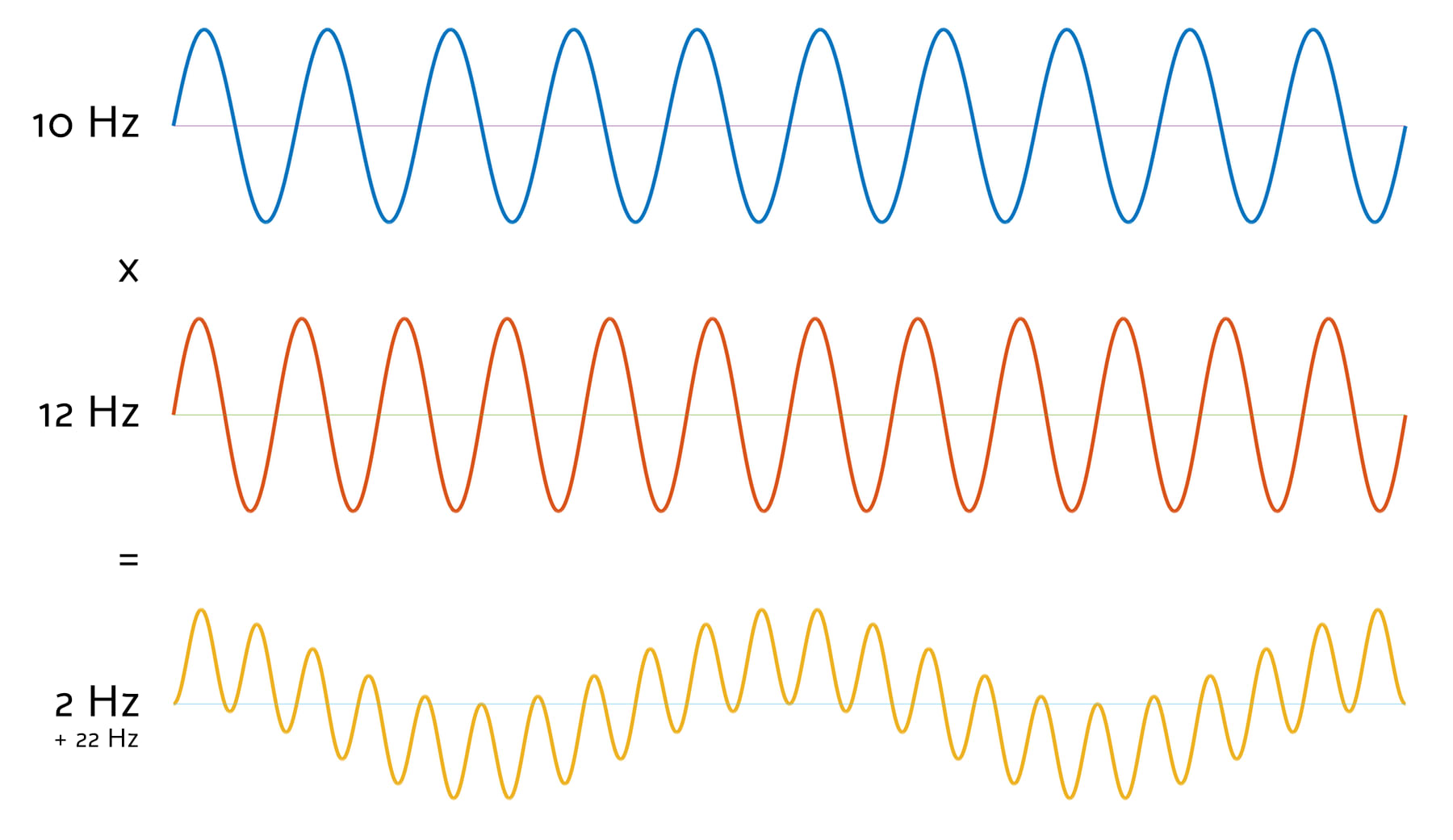 In the aforementioned article, we informally noted that the resulting composite waveforms have shorter periods if the original frequencies are far apart, and longer periods if the frequencies are close. Now, a more precise mathematical model is in order. As it turns out, for scalar multiplication, the low-frequency cycle is always |f1 - f2|, superimposed on top of a (less interesting) high-frequency component f1 + f2: