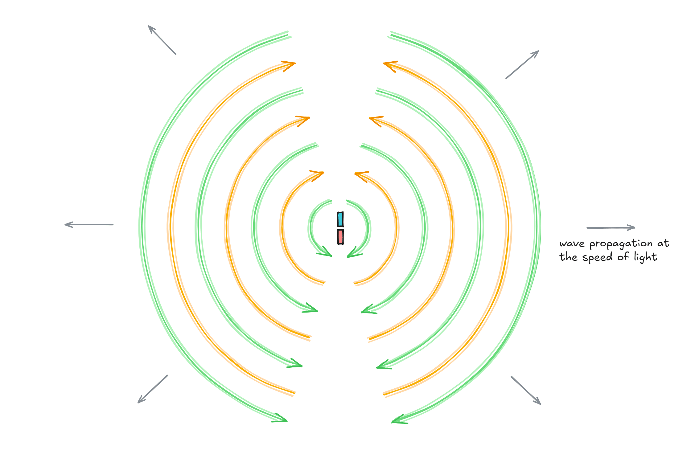 The situation changes if we start moving charges back and forth between the plates. This produces an interesting effect: a ripple-like pattern of alternating fields that are getting away from the ex-capacitor at the speed of light:
