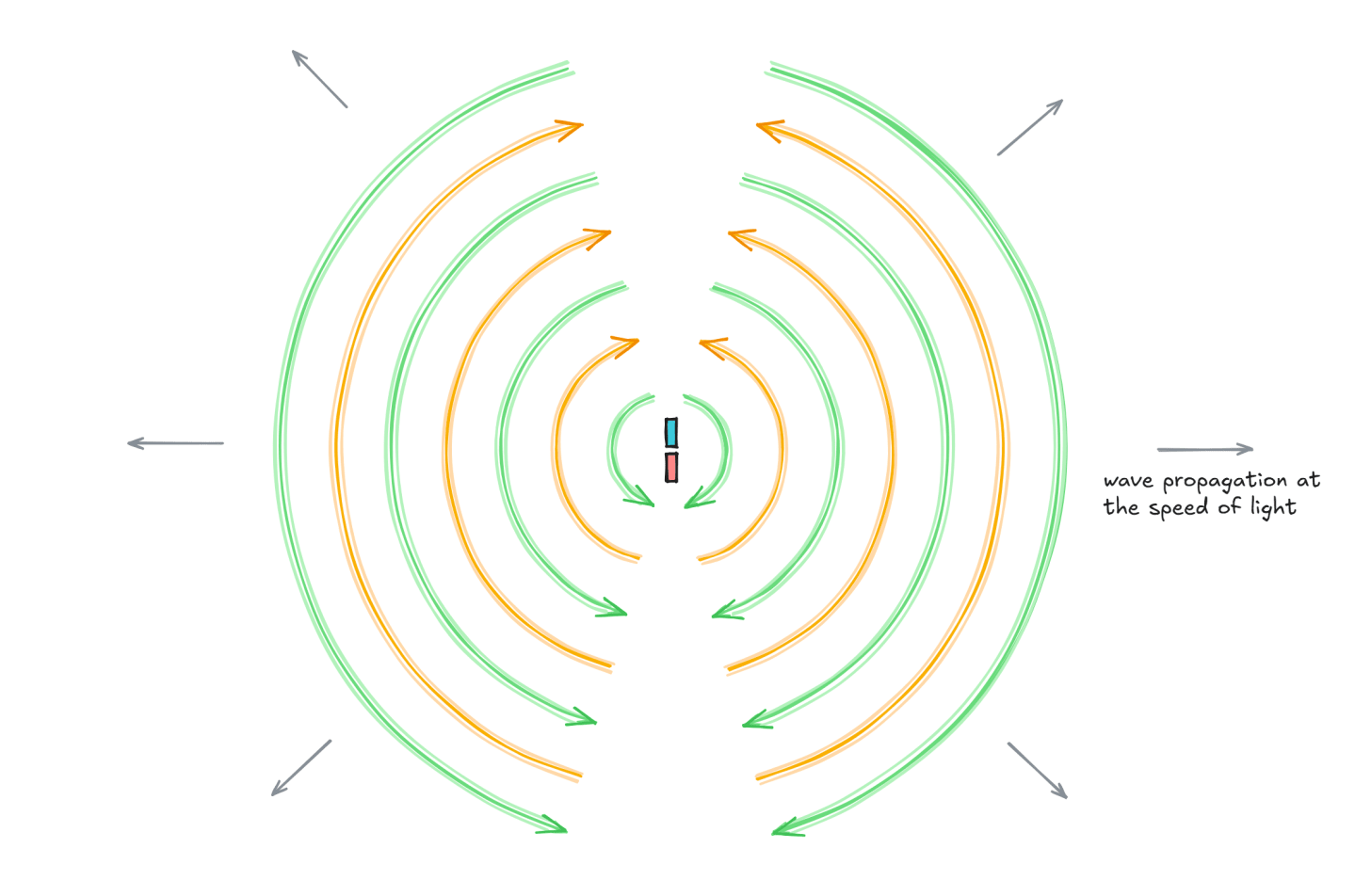 It’s easy to see that the red dipole is “swimming” through a coherent pattern alternating electric fields: the blue region is pulling electrons toward the upper plate, and yellow pushing them down. The antenna experiences back-and-forth currents between its poles at the transmitter’s working frequency. Further, if the antenna’s length is chosen right, there should be constructive interference of the induced currents too, eventually resulting in much higher signal amplitudes.