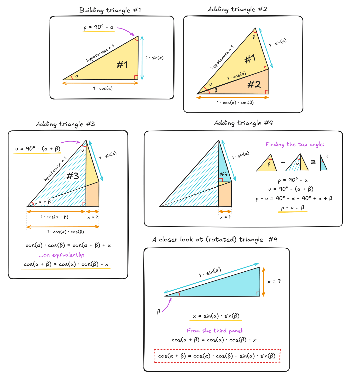 Panel 3 (middle left): we add triangle #3, placing it on top of the other triangles. The new triangle inherits a hypotenuse of 1 from triangle #1, and has a combined angle of α+β as a consequence of being partly inscribed inside #1 and #2. It follows that its adjacent is 1 × cos(α + β).