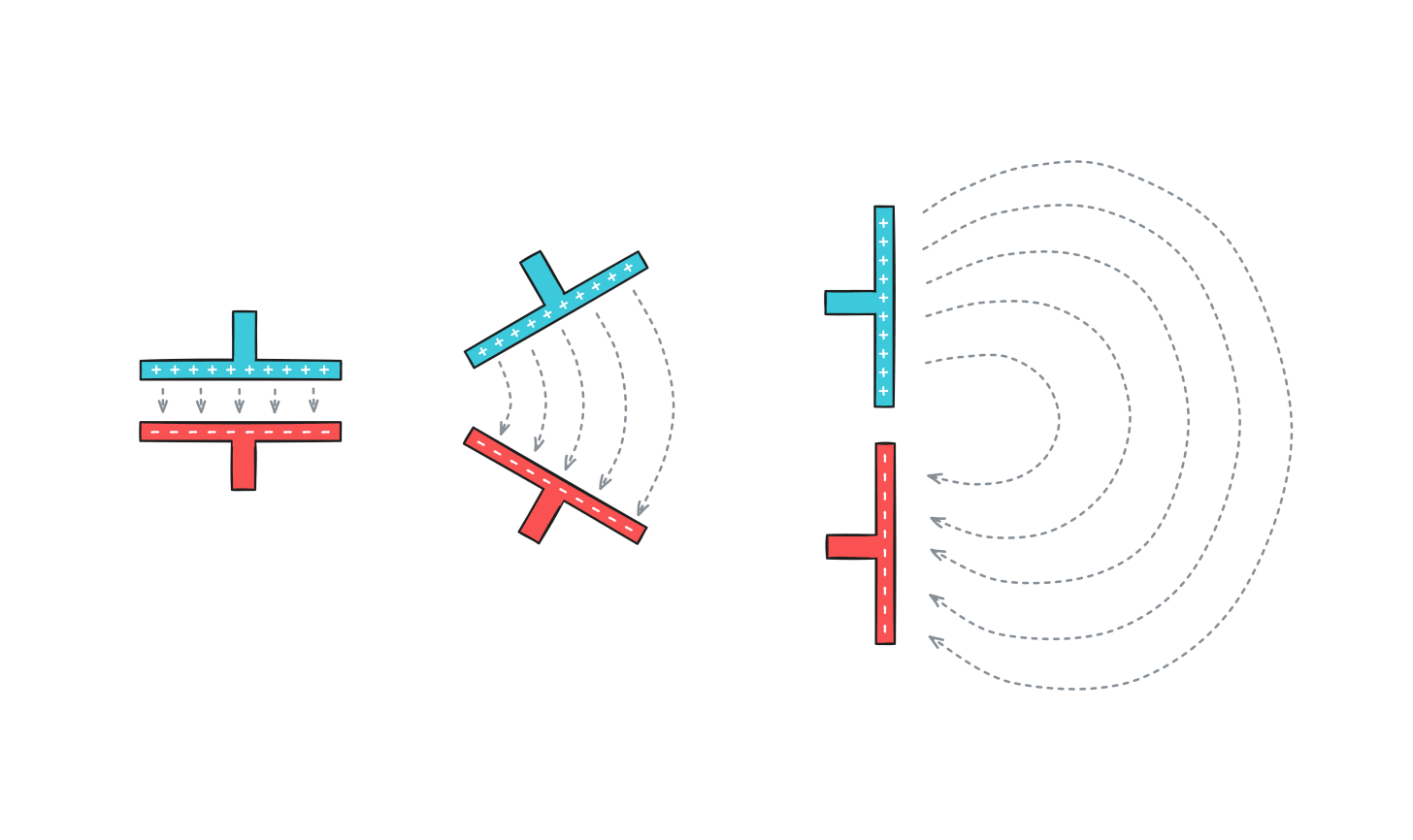 Electric fields can be visualized by plotting the paths of hypothetical positively-charged particles placed in the vicinity. For our ex-capacitor, we’d be seeing arc-shaped lines that connect the plates — and strictly speaking, extend on both sides all the way to infinity.