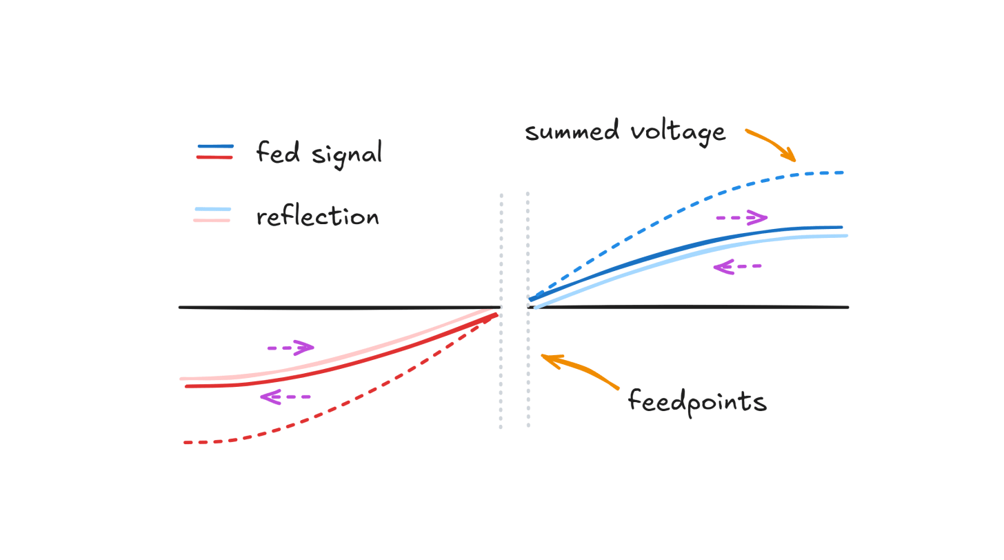 The half-wave dipole has an interesting property: if we take signal propagation delays into account, we can see that every peak of the driving signal reaches the ends of the respective λ/4 rod in a way that adds constructively to the reflection of the previous peak that’s coming back from the high-impedance end: