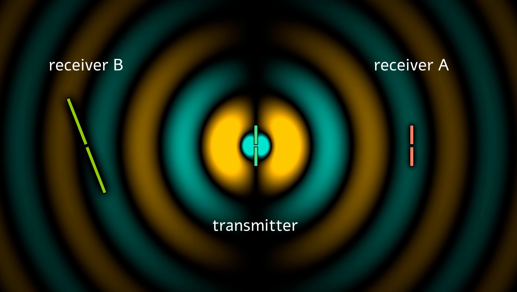 Next, let’s consider what would happen if we placed an identical receiving antenna some distance away from the transmitter. Have a look at receiver A on the right:
