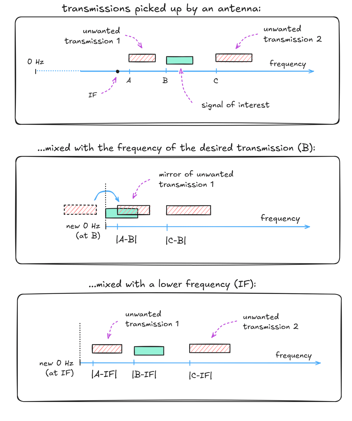 To avoid this mirroring, superheterodyne receivers mix the RF input with a frequency lower than the signal of interest, shifting the transmission to some reasonably low, constant intermediate frequency (IF) — and then using bandpass filters to pluck out the relevant bits before downmixing the IF signal once again. A simple visualization of the benefits of using IF is shown below: