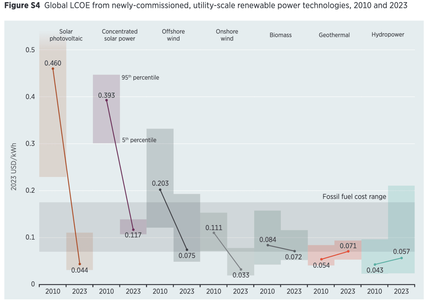 Second, a transition to renewables, which might have seemed like pie-in-the-sky, hippy-dippy stuff a generation ago, is now not just feasible but the only sensible energy strategy. Here’s a chart showing estimates of the levelized cost of electricity generation (LCOE), adjusted for inflation, for a variety of renewable energy technologies, compared with the costs of power from fossil fuels. I’m aware that LCOE is an imperfect measure, but the results are still astonishing: