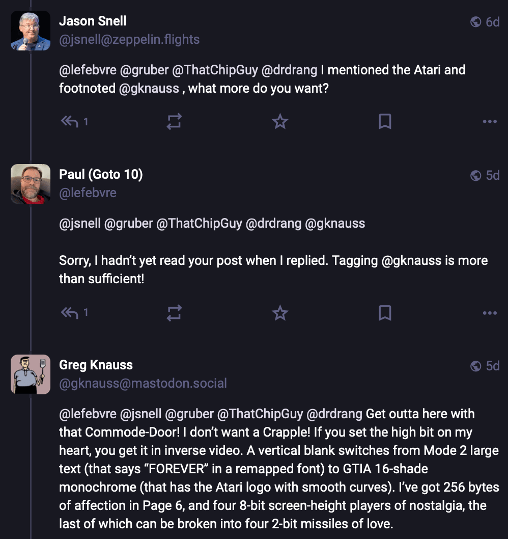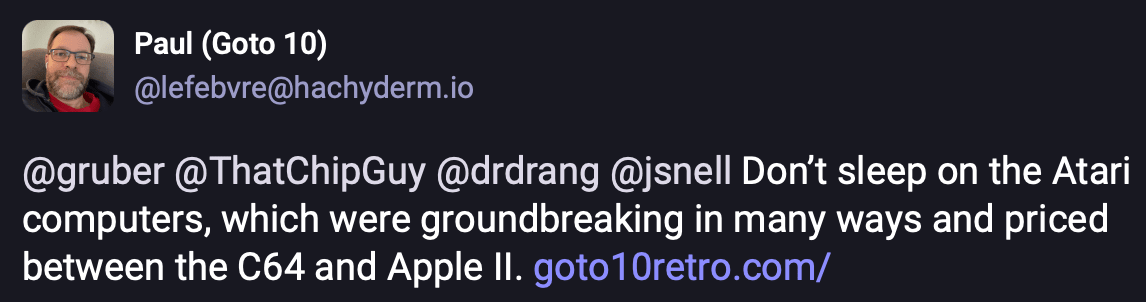 I saw the Daring Fireball post and replied to a Mastodon thread on it with the note “Don’t sleep on the Atari computers, which were groundbreaking in many ways and priced between the C64 and Apple II.” I think I slightly offended Jason Snell with that comment, since he had mentioned Atari in his post.