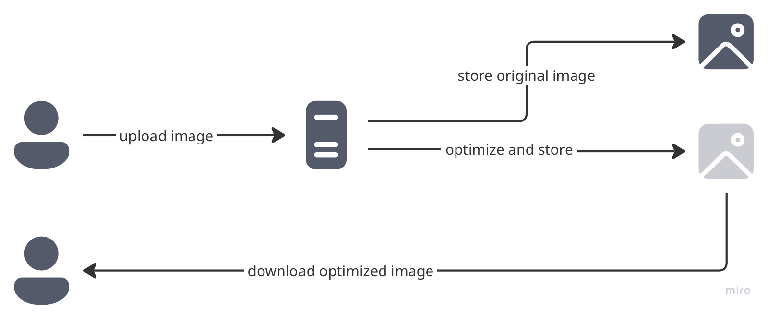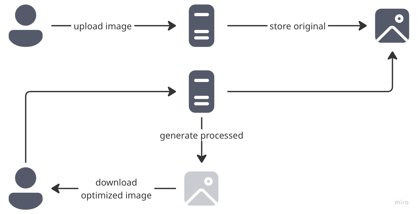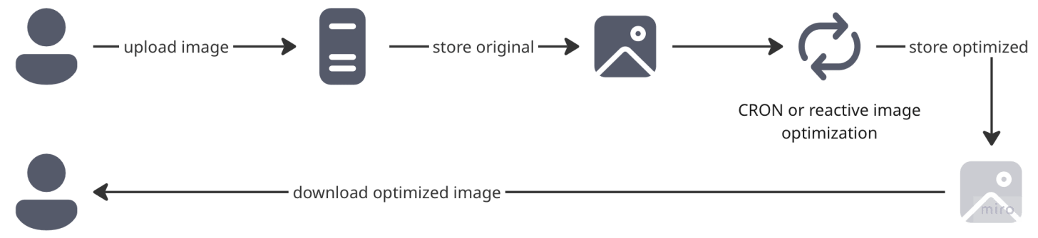 Strategy: OK, so now the server just stores the original image and another service reacts to file creation or runs regularly to process new images and store optimized versions.