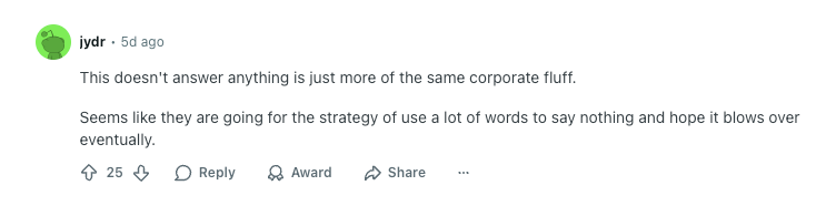 But many in the community saw the response as evasive corporate language that avoided accountability. On Reddit, one commenter described it as "corporate fluff" that uses "a lot of words to say nothing." On Hacker News, a community member wrote, "They present lists questions and then proceed to answer none of them."