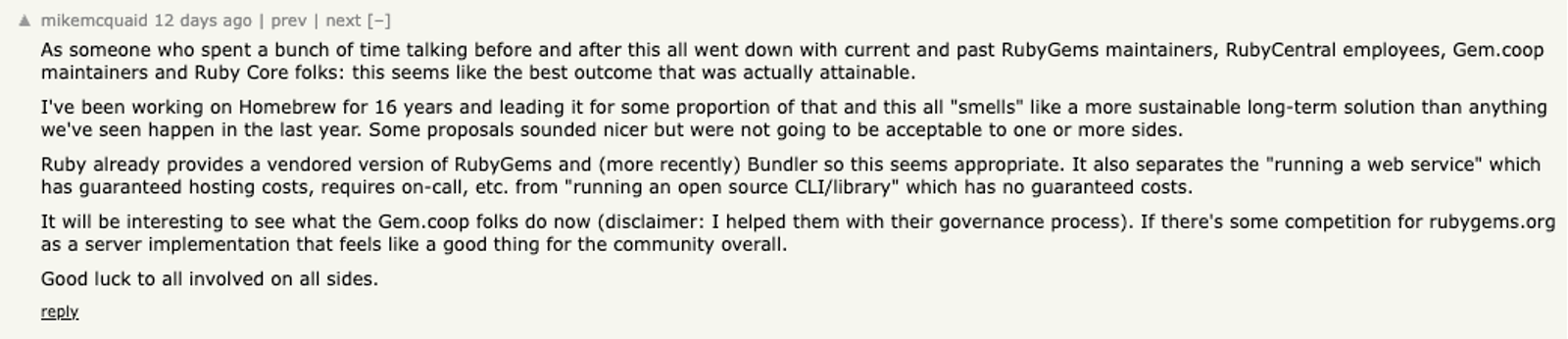 With Matz now assuming stewardship and the former maintainers agreeing to transfer their interests, the Ruby community appears to be moving past the governance crisis toward a more stable structure for maintaining the ecosystem's essential package management tools. However, trust in Ruby Central as a steward organization remains damaged, with community members expressing continued skepticism about the organization's transparency and communication practices.
