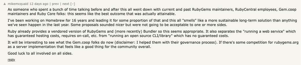One of the original RubyGems authors, Rich Kilmer, expressed support for the move, noting that Ruby Central has been the steward of RubyGems since its inception and that placing it with Matz and the Ruby core team "is the right place."