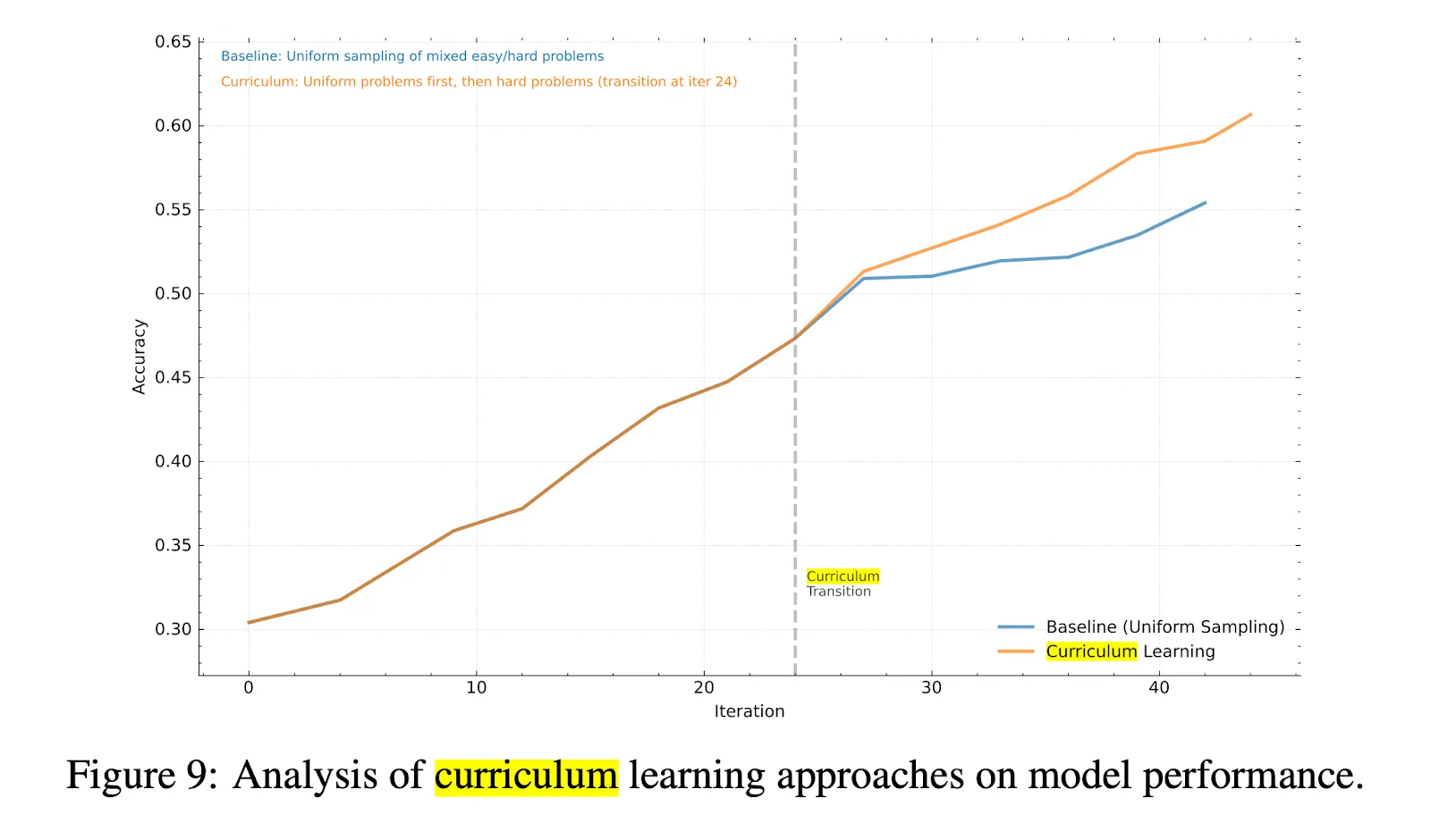 Today, frontier labs are already reaping the benefits of curriculum design when performing RL over foundation models. The rationale and performance gains were nicely explained in Kimi-k1.5’s technical report released in June 2025. They noticed that some tasks are already labelled as trickier than others (e.g. International Mathematical Olympiad problems are obviously harder than primary school math) so they can use curriculum sampling to start training on easier tasks then move to harder tasks. A well designed curriculum lets the agent more easily and consistently access reward across a sequence of tasks, and their method improved accuracy by over 5 percentage points across 15 training iterations.