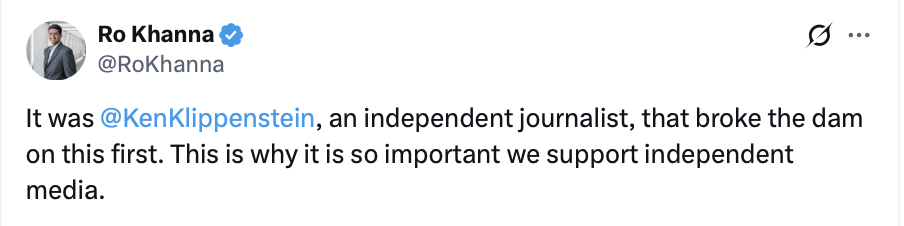 Khanna was also kind enough to shout me out for my work in covering this.“It was @KenKlippenstein, an independent journalist, that broke the dam on this first,” Khanna said. “This is why it is so important we support independent media.”