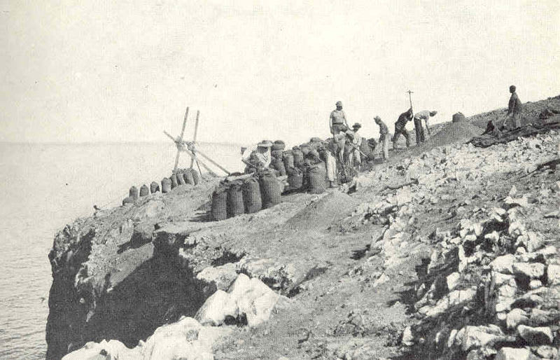 There are not many images of guano mining in the Chincha Islands in the 19th century. This one shows sacks filled with guano by hand. The structure in the background is probably a crane that carries the sacks to boats moored below. The dreary landscape remains a feature of the islands to this day.