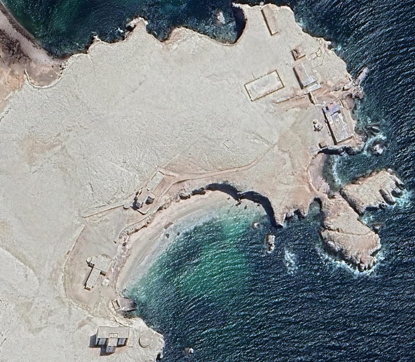 An image from Google Maps of Isla Norte Chincha. It is the only island that shows modern buildings, a road, and a dock, where ships can probably moor. These structures were probably built in the 1960s and now look mostly abandoned. The land is completely barren and treeless on all the islands.