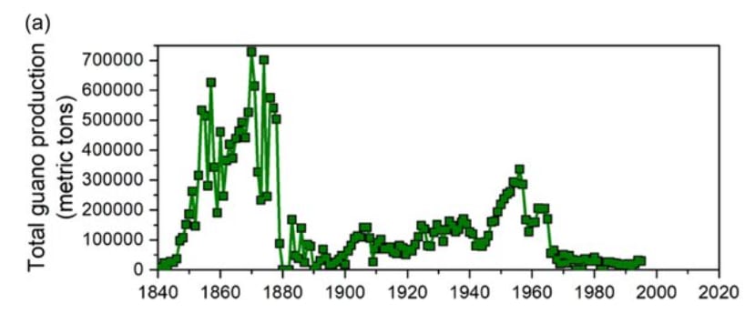 It was another disaster: production soon collapsed, generating a second Seneca Cliff. This crash is normally interpreted as due to the competition with the newly developed Haber-Bosch nitrate factories. That surely had an effect, but it doesn’t completely explain the crash. Guano production required only shovels, and that made it surely cheaper than the nitrates produced by the complex and energy-hungry Haber-Bosch process. As a cheaper fertilizer, guano could have found a niche market. More likely, depletion had played its usual role. With the best of their efforts, the poor birds of the islands couldn’t poop fast enough to keep the production going. It is one of the corollaries of the harsh law of the Seneca Effect: the cliff will be repeated if there is a way to do so.