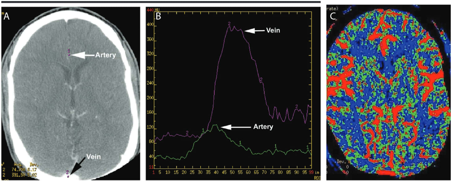 a) Transverse CT image of a healthy human brain during contrast administration. b) Time-concentration curves. c) Cerebral blood flow measured by CT perfusion during following contrast administration. Images modified from Hoeffner et al., 2004.