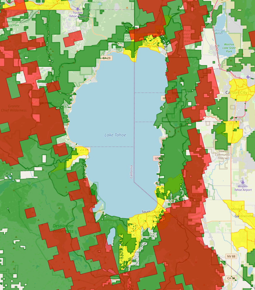 The area around Lake Tahoe is similarly surrounded by mountainous federal land.