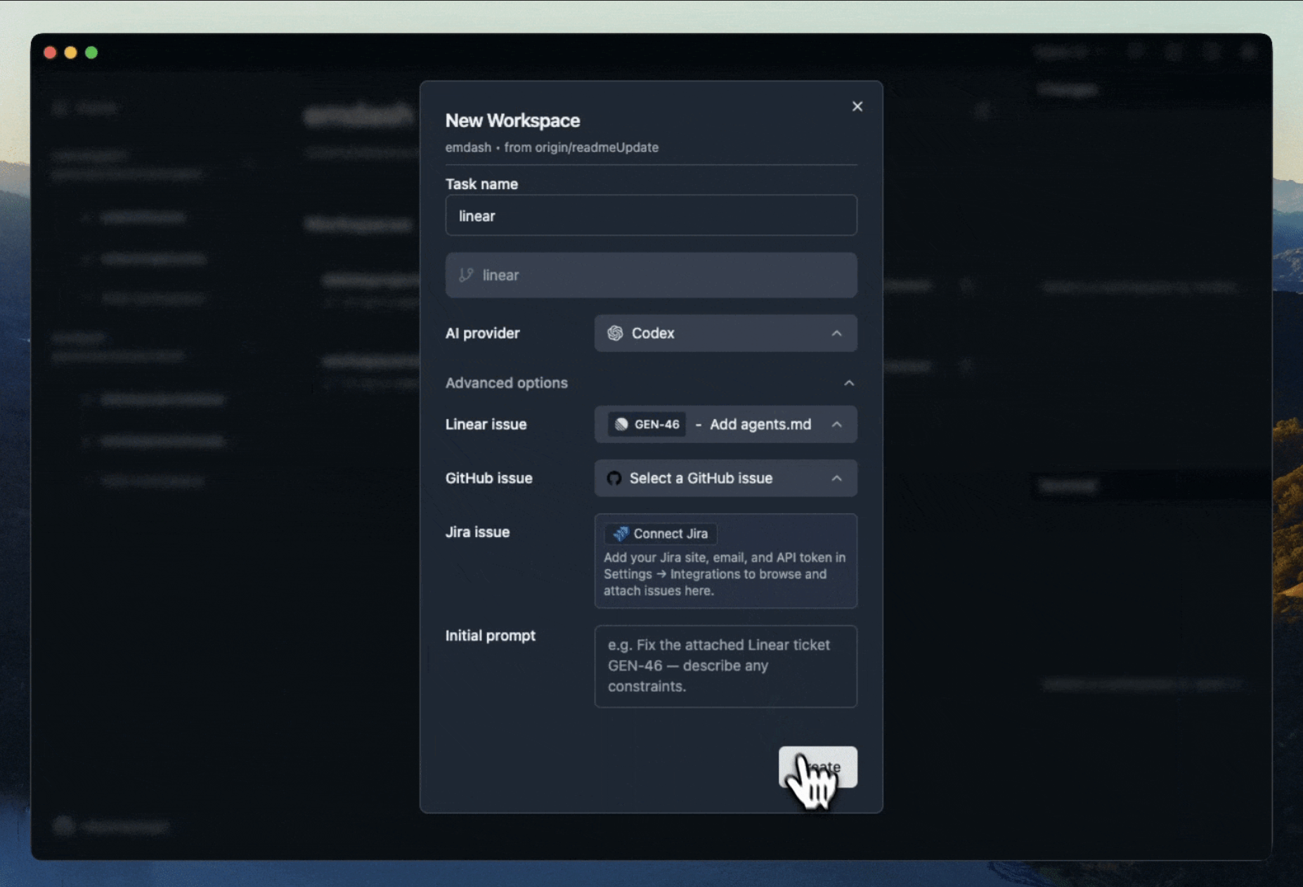 Emdash allows you to pass engineering tickets straight from your issue tracker to your coding agent at workspace creation.