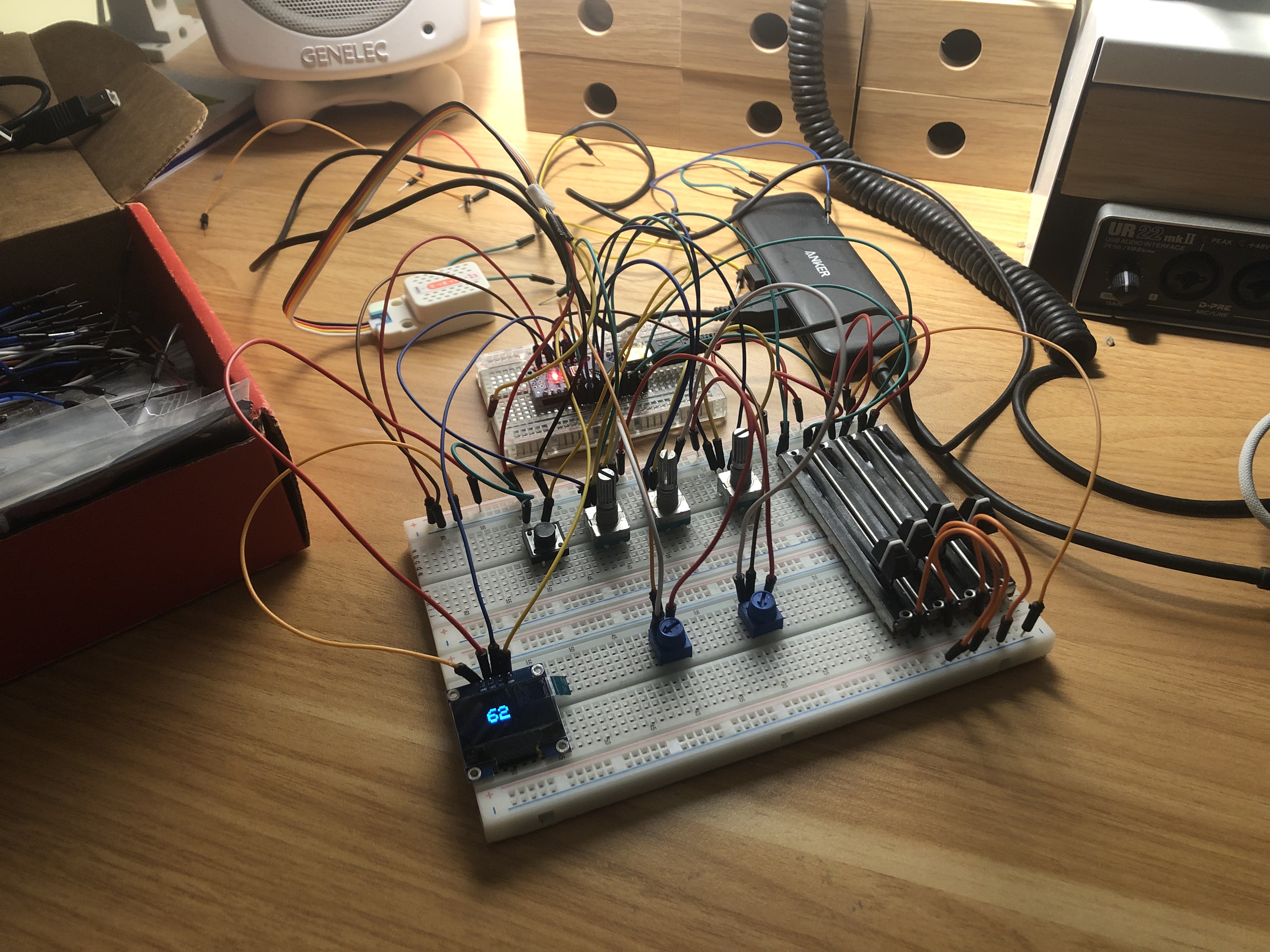 Once I had the hang of wiring up potentiometers and rotary encoders, the next step was to move the audio synthesis from Logic to my breadboard. For this I used a little $12.95 SAM2695 synthesiser module with an integrated amplifier and speaker. Its inner workings remain a mystery to me but it does what I need it to and I was happy reduce the amount of time to get a functioning prototype into my daughter’s hands. I also moved to an Elegoo Nano here due to its low cost and increased number of analog pins.