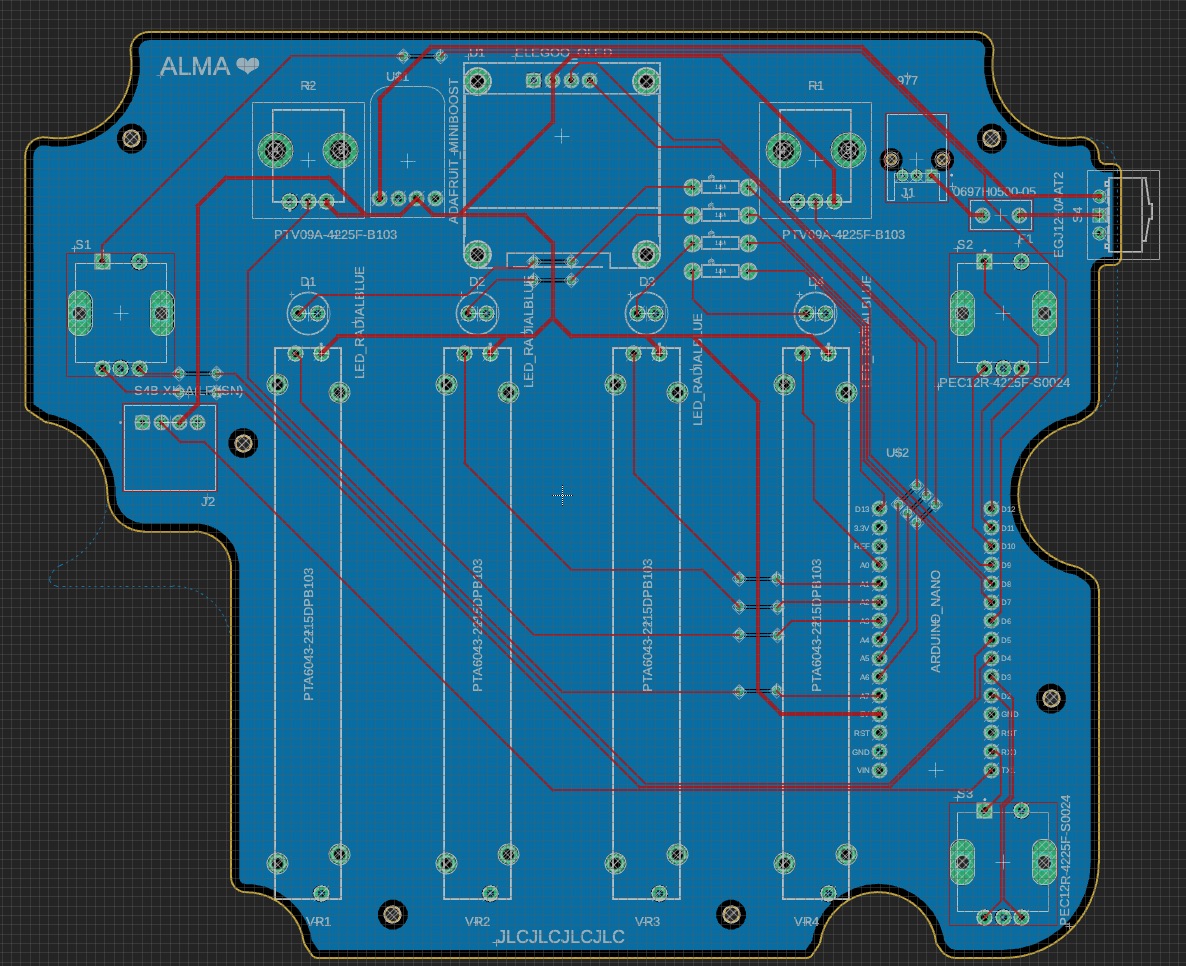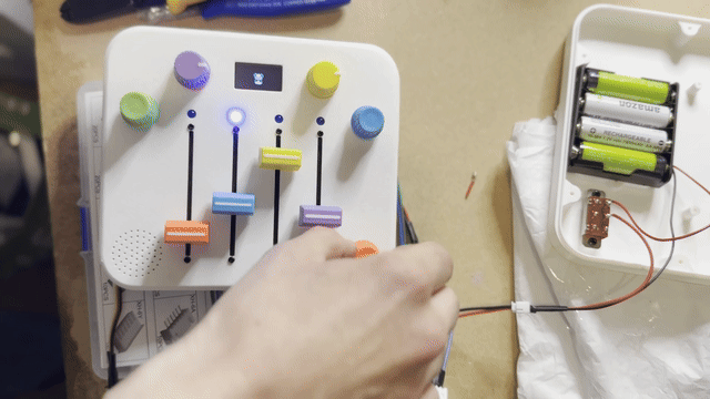 My daughter received a Montessori activity board full of switches and LEDs for her first birthday. Watching her twist knobs and flip the switches reminded me of the control surface of a synth, and I wondered if I could build a musical version - something simple, tactile, and creative that didn’t require holding down buttons to keep the sound going. A year later I finally decided to build it. I had no prior hardware experience, so this became an excuse to learn about microcontrollers, CAD, PCB design, and 3D printing.