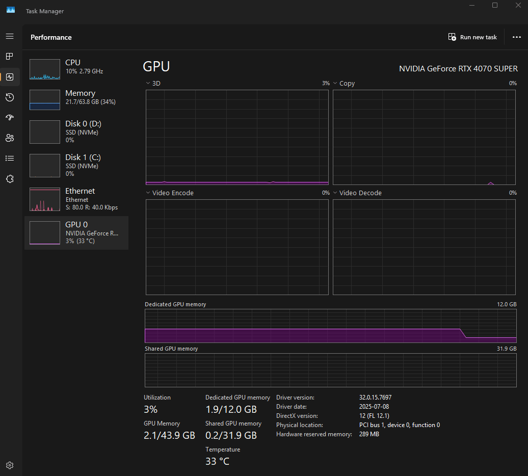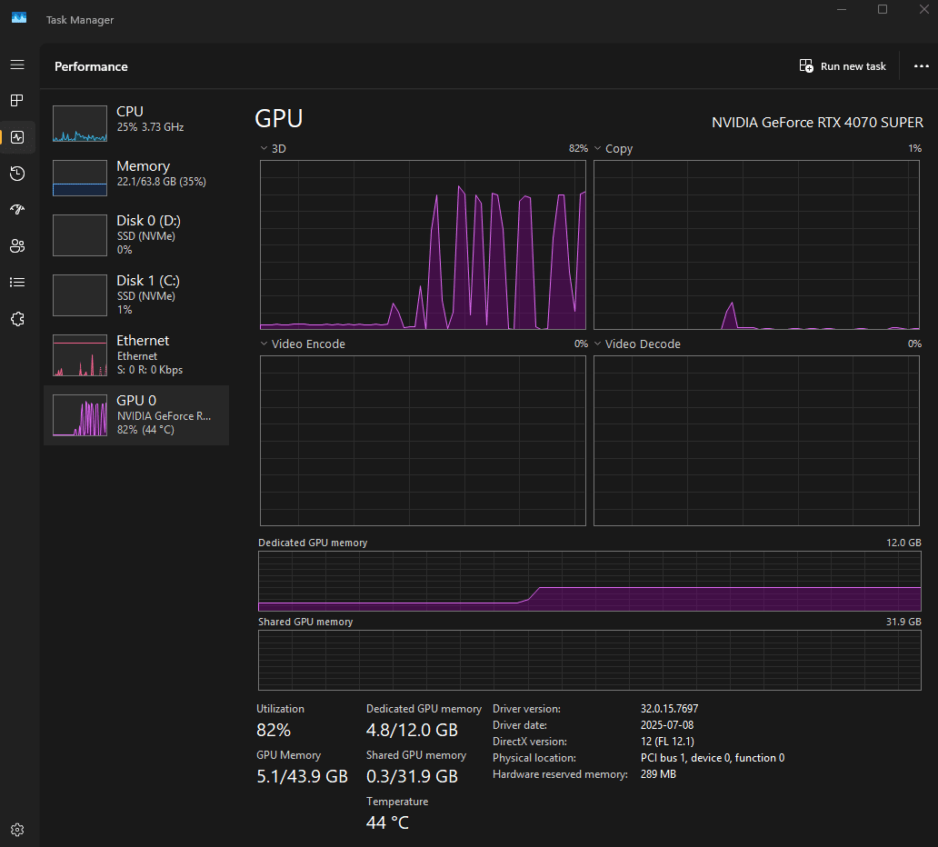 Each of those bumps in the GPU 3D performance corresponds to me issuing a prompt.