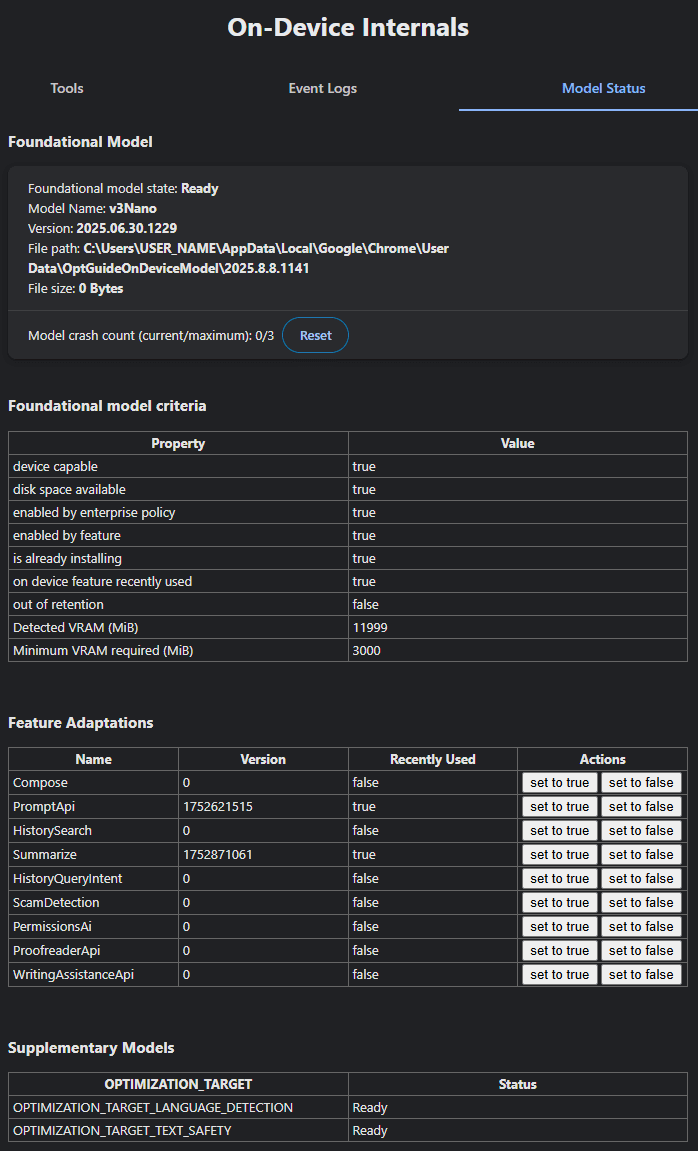 In chrome://on-device-internals/ you can see the status of your model (you may first have to first enable internal debugging pages via chrome://chrome-urls/) but it’ll guide you if you need that.