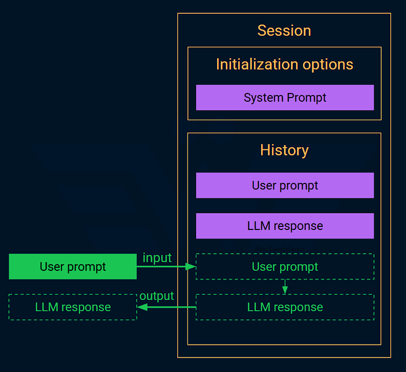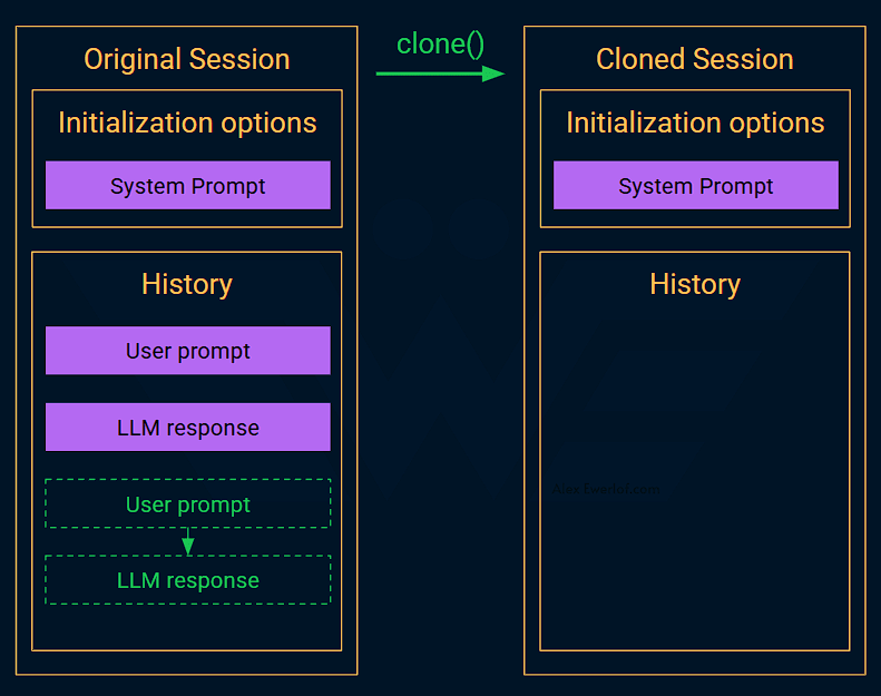 Immutability: You cannot modify the session. This means you cannot modify messages that are already added to it. You can instead use session.clone() on an existing session variable to get a new one. The new session copies the system prompt and initialization options of the old one but doesn’t have any user or assistant messages.