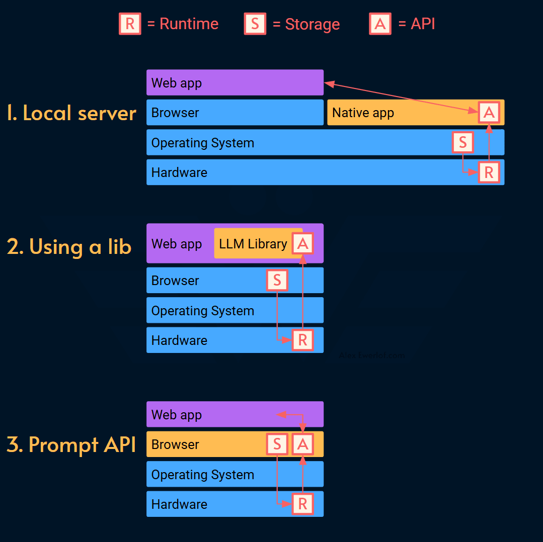Run the language model in the browser: use a library that utilizes the local GPU, CPU, or NPU to run the model. WebLLM, Web NN, or ONNX are some good options. You have more flexibility to download a model and the accompanying library is smart enough to handle the cache using native browser constructs. Some of them even support Service Workers which minimizes the negative impact of heavy AI processing from your UI. However, if this method becomes popular, we’re going to have many pages that need massive downloads and that consumes a lot of network bandwidth and disk space. It’s not sustainable. Which brings us to the latest option. 👇
