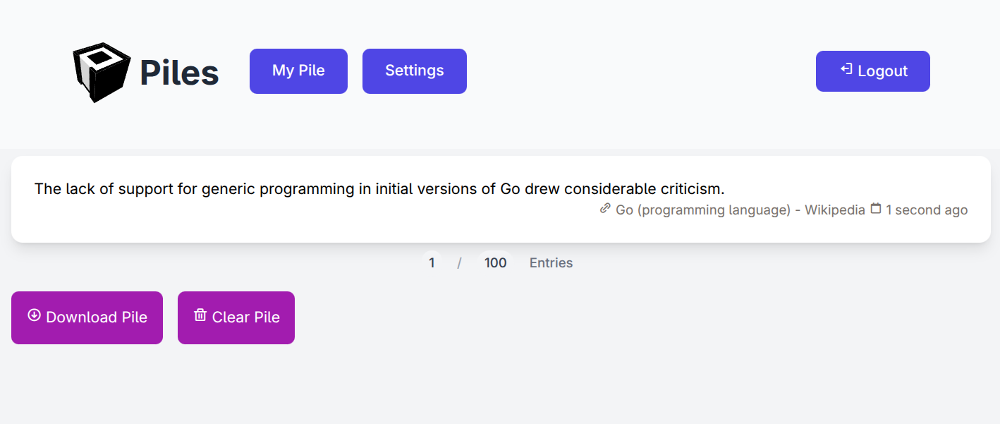Download your Pile, inspect your data and import it in your existing Knowledge Base.