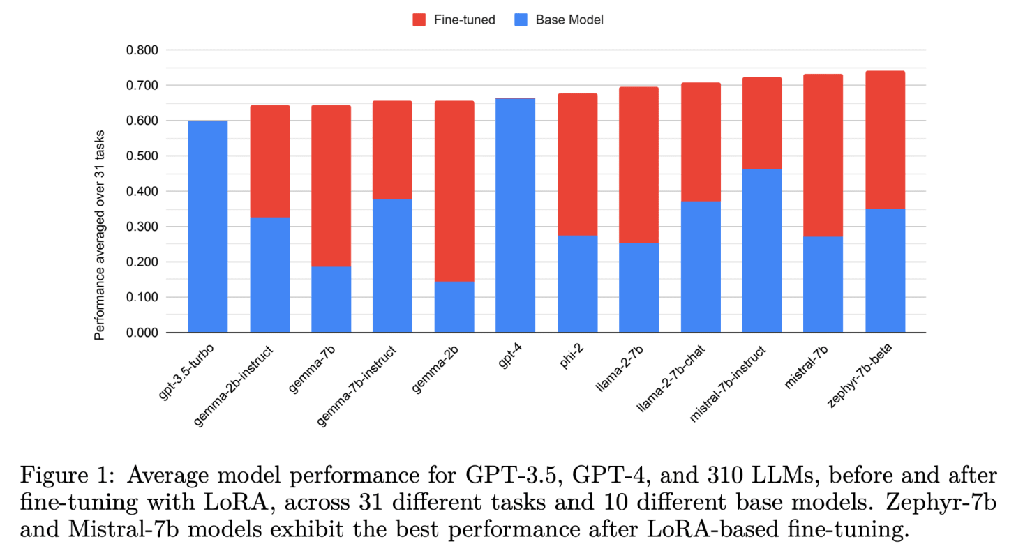 The main finding from the study (see above figure) was that, for the tasks considered, 6 of the 10 small models outperformed GPT-4 on average after fine-tuning. And all 10 smaller models outperformed GPT-3.5-Turbo. We see significant improvements from fine-tuning small base models relative to the base model (i.e., the length of the red bars).