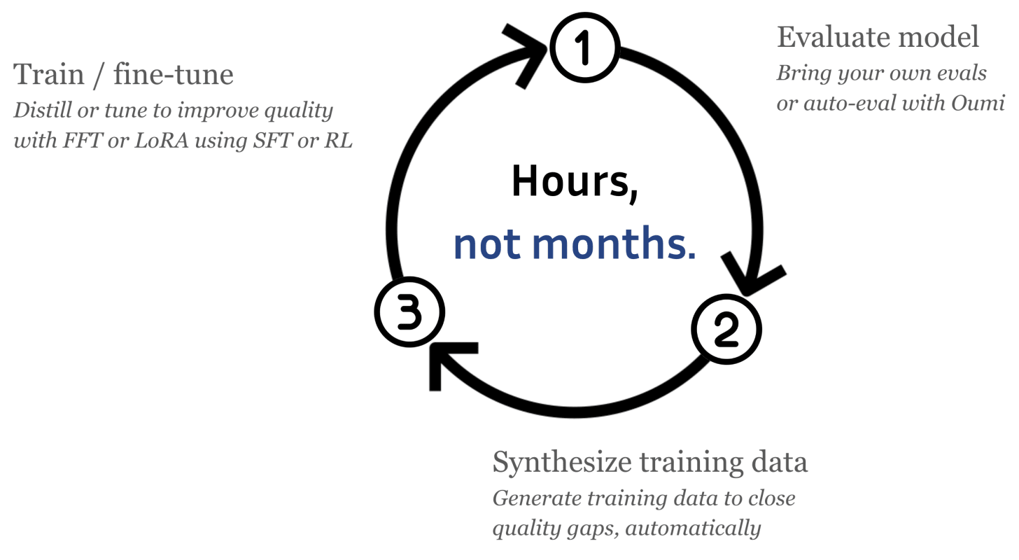 Here at Oumi, we’re specialists in the art of fine-tuning custom AI models for your application. And we do it in hours, not months.