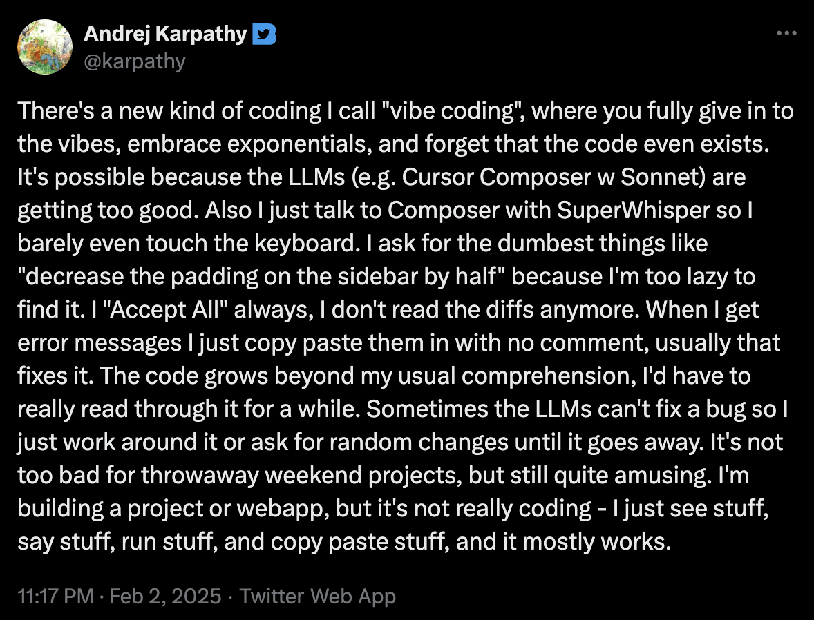 The recent rapid evolution of AI coding tools gives me both excitement and concern. Tools like Cursor, Windsurf, and other AI coding assistants represent an incredible leap forward. They can generate entire code blocks based on simple prompts, creating functioning systems in minutes rather than hours or days. This creates massive opportunities for rapid prototyping, but is the absolute opposite of tinkering.