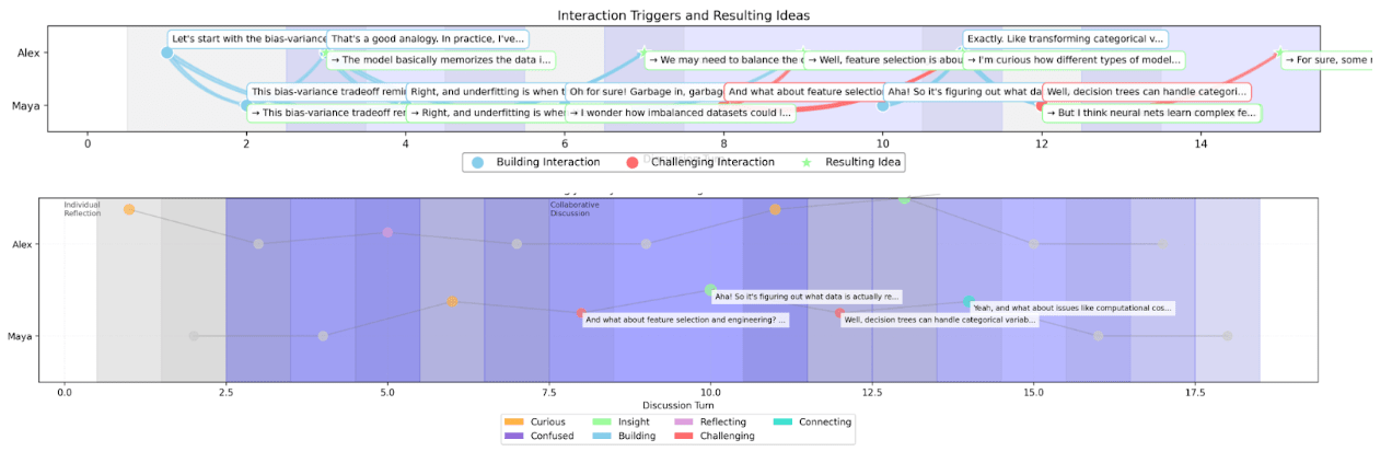 This question drives my research into capturing the social dynamics of curiosity and motivation in learners. I’m building a tool called MoSaIC that combines AI-powered conversation analysis with human expert evaluation to understand how social interactions influence different aspects of learning. This tool analyzes interaction patterns - like questions, challenges and disagreements, idea development, uncertainty, and exploration - across different learning settings, while also integrating participants' subjective experiences. Through this analysis, we can discover patterns like productive disagreements, collaborative problem-solving sequences, moments where students teach each other, and expressions of shared discovery.