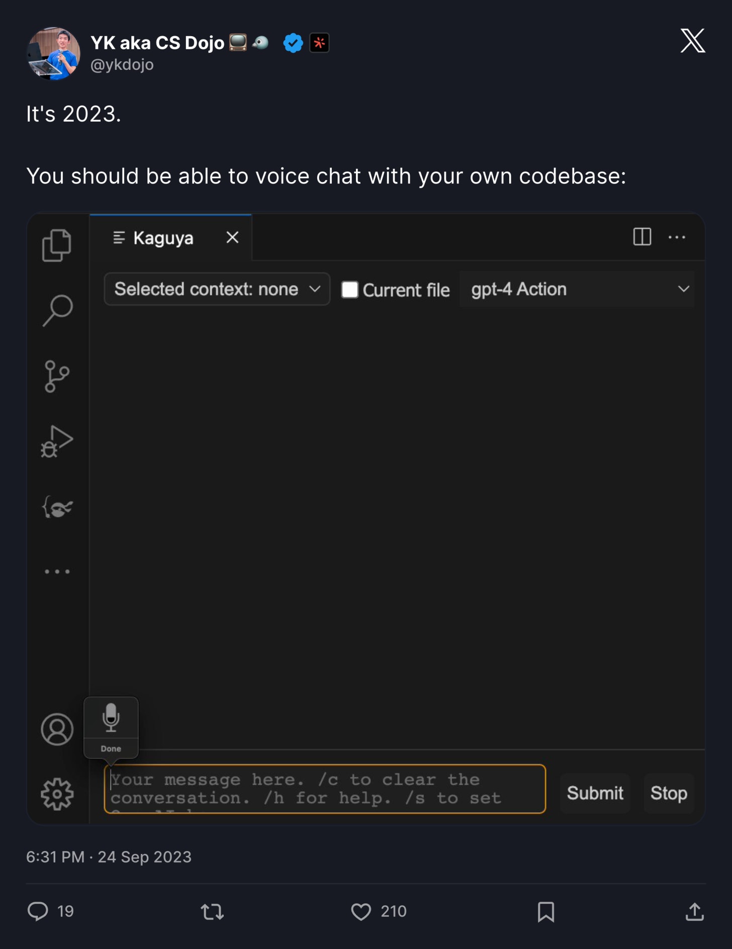 It was an open source agent I built myself called Kaguya. I built it as a ChatGPT plugin that gave it access to my local drive, allowing it to write files, read files, edit files, and run code—Bash, Python, JavaScript—on its own.