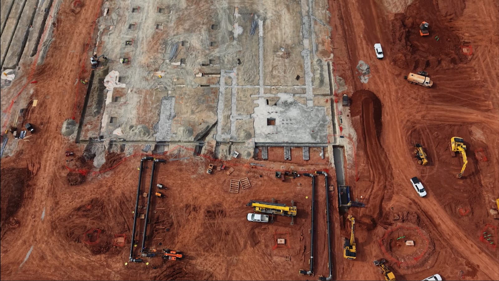 In this (outdated) overhead image we can effectively see a timelapse of construction in the progress of buildings from left to right. Beginning with basic site preparation and base layer foundations, to initial scaffolding and support, to roofing and eventually full envelope.