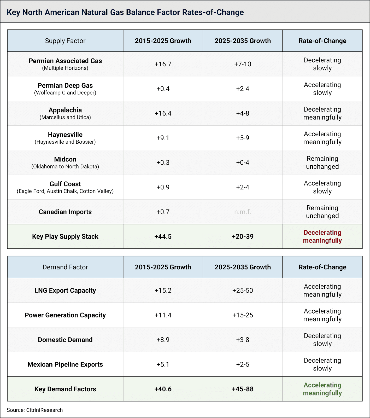 While latent growth from the Permian can answer some of that call, it’s becoming plain-as-day evident we’re going to hit a wall, and run out of cheap gas over the next few years. Below we show historical year-over-year growth from the key US gas plays, and forward demand projections from just LNG export facilities and data centers. We have built these forecasts using gas turbine delivery schedules, and FERC export filings. This gas demand forecast isn’t an estimate, it’s backed by committed infrastructure. What we’ve come to appreciate is that while the world expects the Permian to provide the gas growth to fuel all future projects – the Permian’s associated gas is dangerously “oversubscribed”, and the other dry gas plays will need to fill the gap with record-setting annual growth.
